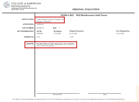 近日,美国病理学家协会(College of American Pathologists,CAP)公布了2022下半年NGS Bioinformatics Solid Tumor( NGSB-A 2022)能力验证项目的结果报告。NGSB是CAP组织的用于评估全球基因诊断实验室NGS数据分析能力验证项目,用于评估实验室的生物信息分析流程。鹍远生物旗下医学检验所凭借成熟的生物信息学分析能力,又一次满分通过CAP的能力评估,强有力地证明了鹍远生物在生物信息学分析能力、临床解读能力、质控体系等方面的综合实力,同时表明了鹍远生物的检测报告在全球范围内具有说服力。