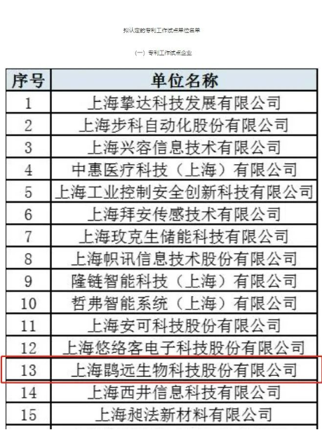 近日,上海市知识产权局发布《2022年拟认定上海市专利工作试点示范单位公示》名单。凭借产品优势、创新能力、研发投入、专利战略及专利数量,鹍远生物入选《2022年上海市专利工作试点企业》拟认定名单。上海市认定“专利试点”和“示范企业”工作具有重要意义,旨在推进企业专利工作,增强企业核心竞争力,加速提升全市企事业单位知识产权创造质量、保护效果、运用效益、管理水平的能力
